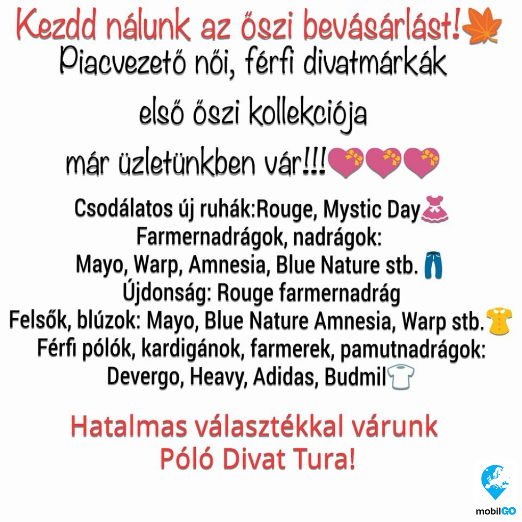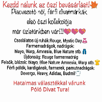 Márkás, trendi, alkalmi és sportos, női-férfi felsőruházat, kiegészítők. Méretek: XS-től 5XL-ig, 36-tól 56-ig. Hetente megújuló árukészlet.