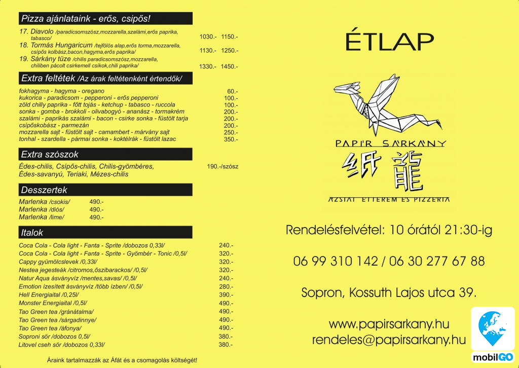 A Papír Sárkány Étterem az ételeket mindíg frissen,kizárólag rendelésre készítík el.rendelését 60 percen belül kiszállítjuk Sopronban,azonban ez rossz időjárási viszonyok vagy forgalmi akadályoztatás esetén váltizhat.Minimális rendelési érték: 990 ft.
