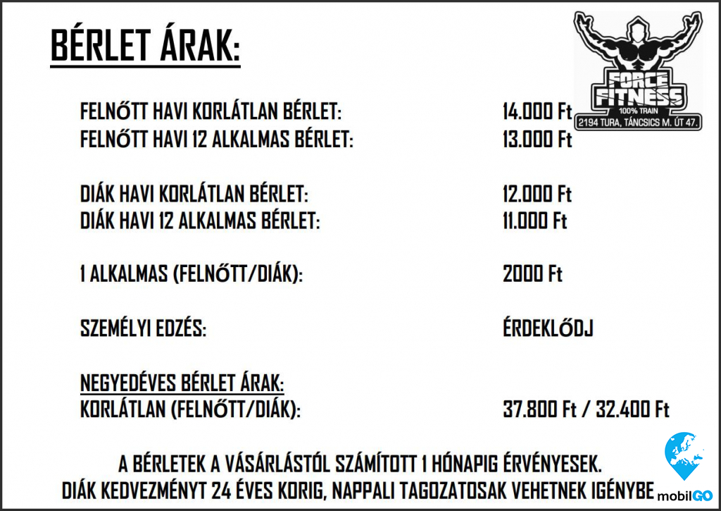 Force Fitness bérlet árak